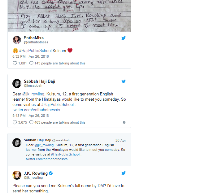 ദോഡയിലെ ഹാജി പബ്ലിക് സ്കൂളിലെ അവളുടെ അധ്യാപിക ട്വിറ്ററിൽ ഷെയർ ചെയ്ത ആ ഉപന്യാസം റൗളിങ് വായിക്കുക മാത്രമല്ല, കുൽസുമിന് എന്തെങ്കിലും അയച്ചു കൊടുക്കണമെന്ന ആഗ്രഹവും പ്രകടിപ്പിച്ചു.