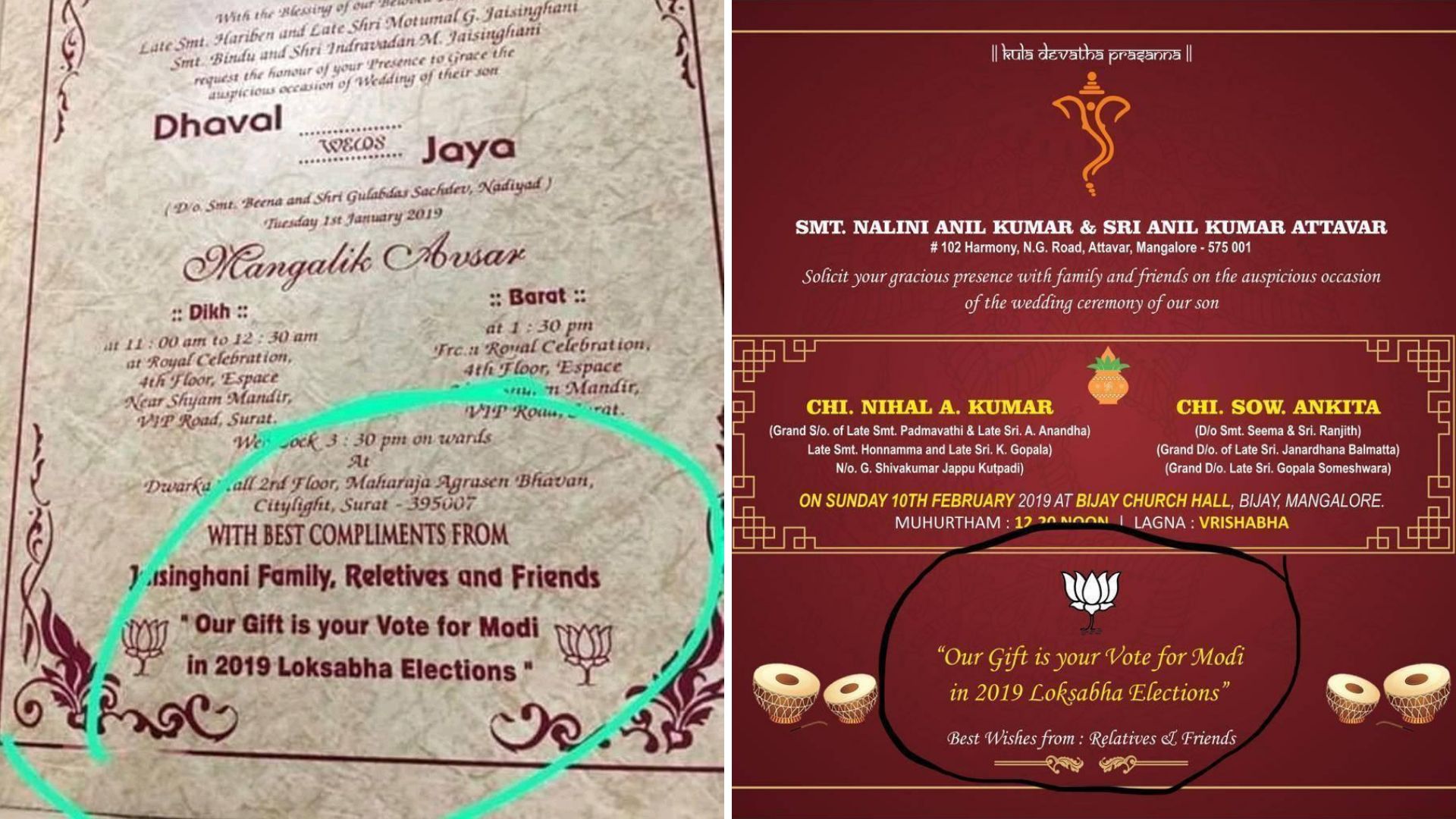 നരേന്ദ്ര മോദിയ്ക്കു വോട്ട് അഭ്യർഥിച്ചുള്ള വിവാഹക്ഷണക്കത്തുകൾ സമൂഹമാധ്യമങ്ങളിൽ വൈറലാകുന്നു. ‘മകളുടെ വിവാഹത്തിന് സമ്മാനം വേണ്ട. 2019ലെ തിരഞ്ഞെടുപ്പിൽ 'നരന്ദ്രമോദിക്കു വോട്ട് ചെയ്താല് മതി' എന്ന് പറഞ്ഞു വധുവിന്റെവീട്ടുകാരാണ് ക്ഷണപത്രം തയ്യറാക്കിയിരിക്കുന്നത്.
