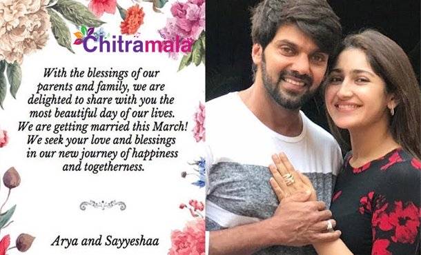 'മാതാപിതാക്കളുടെയും കുടുംബത്തിന്റെയും അനുഗ്രഹാശിസ്സുകളോടെ ഞങ്ങളുടെ ജീവിതത്തിലെ ഏറ്റവും മനോഹരദിനത്തില് തന്നെ പറഞ്ഞു കൊള്ളട്ടെ. ഈ മാര്ച്ചില് ഞങ്ങള് വിവാഹിതരാവുകയാണ്. ഏവരുടെയും സ്നേഹവും അനുഗ്രഹവും ഉണ്ടാകണമെന്ന് ആഗ്രഹിക്കുന്നു..' ആര്യയും സയേഷയും ഇതേ കുറിപ്പാണ് ട്വീറ്റ് ചെയ്തിരിക്കുന്നത്.