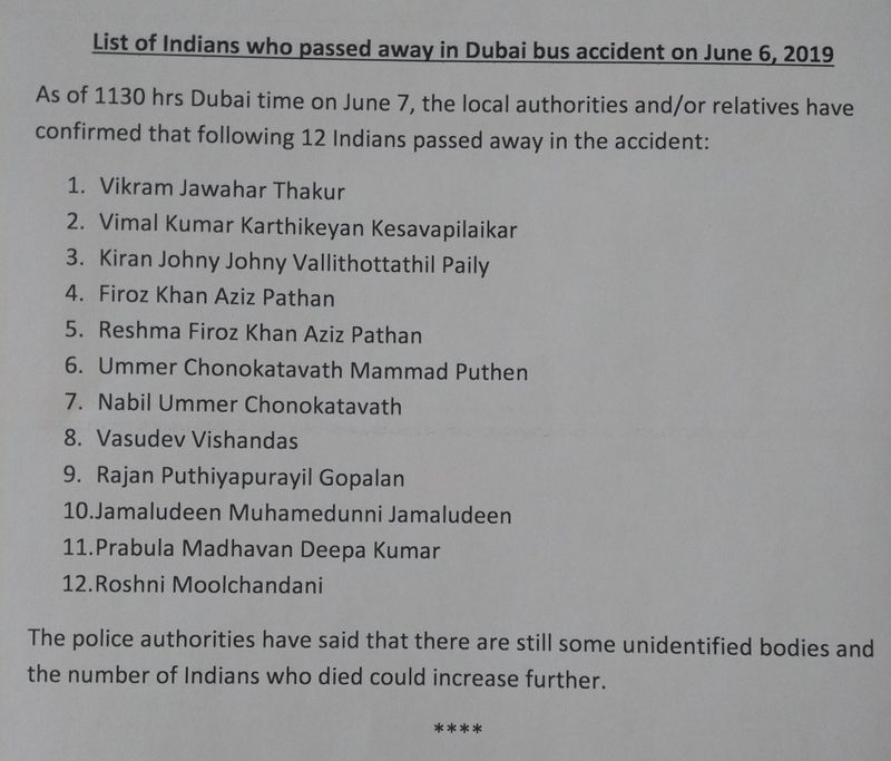 ദുബായിലെ വാഹനാപകടത്തില് മരിച്ച ഇന്ത്യക്കാരുടെ എണ്ണം 12 ആയി