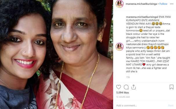 അമ്മയുടെ പുതിയ തയ്യൽക്കട തുടങ്ങുകയാണ് എന്നറിയിച്ചുകൊണ്ടായിരുന്നു മറീനയുടെ കുറിപ്പ്. 'എനിക്ക് പണി കുറഞ്ഞപ്പോൾ എന്റെ അമ്മക്ക് വീണ്ടും പണി ആയി. അമ്മയൊരു തയ്യൽക്കട തുറക്കാൻ പോവുകയാണ്. എല്ലാവരുടെയും പ്രാർത്ഥന വേണം,'ആ കണ്ണുകള്ക്ക് താഴെ കാണുന്ന കറുപ്പ് സ്വന്തം മകളെ വളര്ത്താന് അനുഭവിച്ച കഷ്ടപ്പാടുകളെയാണ് സൂചിപ്പിക്കുന്നത്.രാത്രി ഉറക്കമിളച്ച് ഇരുന്ന് നാട്ടുകാരുടെ വസ്ത്രങ്ങള് തയ്ച്ചു കൊടുത്തപ്പോള് കിട്ടിയ സമ്മാനമാണത് അത്. ഞാന് വലിയ കുടുംബത്തില് നിന്നുള്ള തോന്ന്യാസക്കാരിയായ പെണ്കുട്ടിയാണെന്ന് ചിന്തിക്കുന്നവര് ശ്രദ്ധിക്കുക. ഞാന് അങ്ങനെയല്ല. തോല്ക്കുന്നെങ്കില് തോറ്റു പോവട്ടെ, പക്ഷേ, അഭിമാനം നഷ്ടപ്പെടുത്തരുതെന്നാണ് അമ്മ പഠിപ്പിച്ചിട്ടുള്ളത്.എല്ലാ പെണ്കുട്ടികളും ഇതുപോലൊരു അമ്മയെ അര്ഹിക്കുന്നുണ്ട്. അമ്മ ഒരു പോരാളിയായിരുന്നു. ഇപ്പോഴും അങ്ങനെ തന്നെ'- മറീന ഇൻസ്റ്റഗ്രാമിൽ കുറിച്ചു.