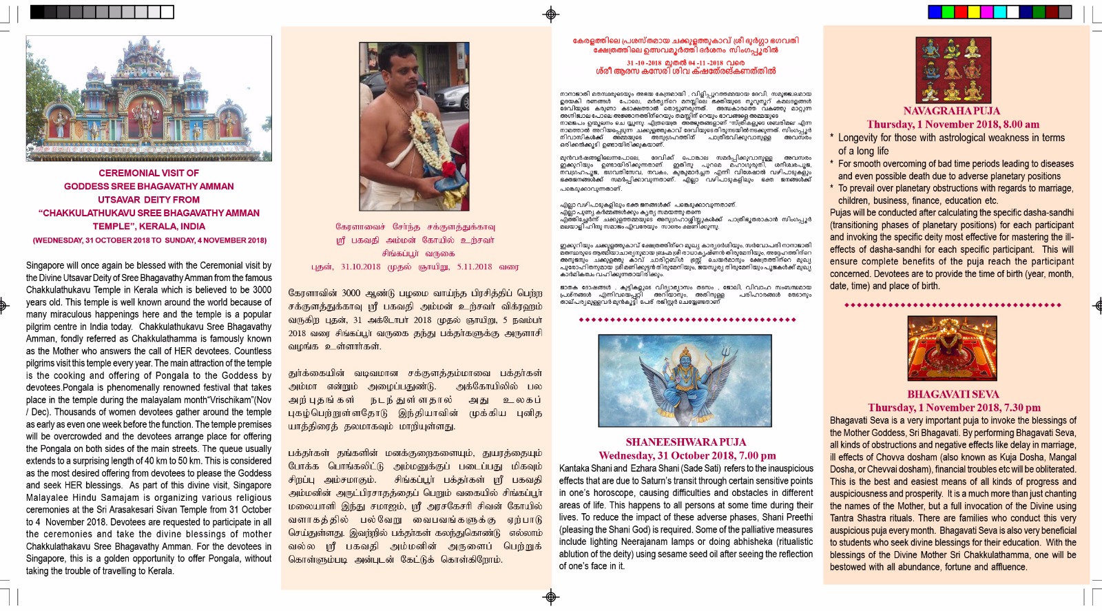 ജാതിമതഭേദമെന്യ സകല മനുഷ്യരുടേയും അഭയകേന്ദ്രമായി മാറിയ പുണ്യപുരാതന ദേവാലയമാണ് ചക്കുളത്തുദേവീക്ഷേത്രം. വിളിച്ചാല് വിളിപ്പുറത്തുള്ള അഭീഷ്ടവരദായിനിയാണ് ചക്കുളത്തമ്മ. അന്ധകാരത്തെ വകഞ്ഞു മാറ്റുന്ന അഗ്നിജ്വാല പോലെ അജ്ഞാനത്തിന്റെയും തമസ്സിന്റെയും ഭാവങ്ങളെ അമ്മയുടെ നാമജപം ഉന്മൂലനം ചെയ്യുന്നു. എത്രയെത്ര അത്ഭുതങ്ങളാണ് “സ്ത്രീകളുടെ ശബരിമല” എന്നറിയപ്പെടുന്ന ചക്കുളത്തുകാവ് ദേവിയുടെ തിരുനടയില് നടക്കുന്നത്. സിംഗപ്പൂര് നിവാസികള്ക്ക് അമ്മയുടെ അനുഗ്രഹത്തിന് പാത്രീഭവിക്കുവാനുള്ള അവസരം ഒരിക്കല്കൂടി ഉണ്ടായിരിക്കുകയാണ്