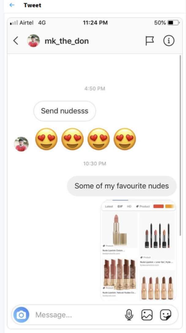 നഗ്നചിത്രങ്ങള് അയച്ചുതരാന് ആവശ്യപ്പെട്ട് ഒരു യുവാവ് ചിന്മയിക്ക് സന്ദേശം അയച്ചു. സന്ദേശത്തിന് ചിന്മയി നല്ല കിടിലൻ മറുപടിയും കൊടുത്തിട്ടുണ്ട്. ന്യൂഡ് ലിപ്സ്റ്റികുകളുടെ ചിത്രം അയച്ചു കൊടുത്താണ് ചിന്മയി അയാളുടെ ഞരമ്പുരോഗം തീർത്തത്.