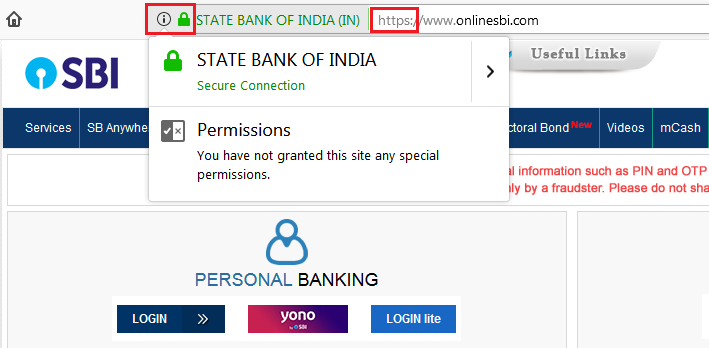 നിങ്ങളുടെ ബാങ്കിന്റെ വെബ്സൈറ്റ് അഡ്രസ് സുരക്ഷിതമാണോ എന്ന് ഉറപ്പു വരുത്തുക. (ഉദാഹരണത്തിന് മുകളിലെ ചിത്രം ശ്രദ്ധിക്കുക)