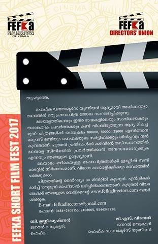 ലോകത്തിൻറെ ഏത് ഭാഗത്തായാലും ശരി. ഒരു ഷോർട്ട് ഫിലിം ഉണ്ടോ കയ്യിൽ? എന്നാൾ പോന്നോളൂ ഫെഫ്ക ഒരുക്കുന്ന ഹ്രസ്വ ചലച്ചിത്ര മത്സരത്തിൽ പങ്കെടുക്കാൻ. അഖിലേന്ത്യാ തലത്തിലാണ് മത്സരം. വിദേശ മലയാളികൾക്കും പങ്കെടുക്കാം. മലയാളത്തിലേയും ഇതര ഭാഷയിലേയും പ്രഗത്ഭരാണ് ജഡ്ജിംഗ് പാനൽ അംഗങ്ങൾ. മലയാളത്തിലോ മറ്റ് ഭാഷകളിലോ ഹ്രസ്വചിത്രം ചിത്രീകരിക്കാം. മറ്റ് ഭാഷയിലുള്ളവയ്ക്ക് സബ് ടൈറ്റിൽ നിർബന്ധമാണ്.