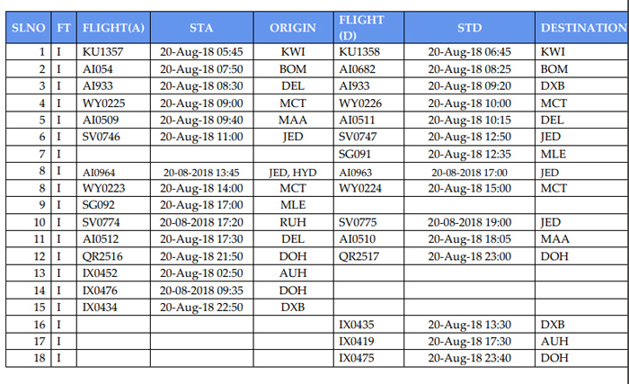 ബംഗലൂരുവിൽ നിന്ന് തന്നെ 8.10നും 12.30യ്ക്ക് കൊച്ചിയിലേക്ക് വിമാനം എത്തും. ഈ വിമാനങ്ങൾ തിരിച്ച് ബംഗലൂരുവിലേക്ക് പറക്കുകയും ചെയ്യും. ഇപ്പോൾ എയർ ഇന്ത്യാ വിമാനങ്ങൾ മാത്രമാണ് ഇറങ്ങുന്നതെങ്കിലും നാളെ ഇൻഡിഗോ, ജെറ്റ് എയർവേയ്സ് വിമാനങ്ങൾ സർവ്വീസ് നടത്താനാണ് തീരുമാനിച്ചിരിക്കുന്നത്. ഇതിന്റെ ഭാഗമായി ഇൻഡിഗോയും ജെറ്റ് എയർവേയ്സും ഇന്ന് പരീക്ഷണ പറത്തുമെന്നാണ് അറിയിച്ചിരിക്കുന്നത്. അതേസമയം തിരുവനന്തപുരം വിമാനത്താവളത്തിൽ നിന്നും പുറപ്പെടും എനറിയിച്ചിരിക്കുന്ന വിമാനങ്ങളുടെ ലിസ്റ്റ് ചുവടേ കൊടുക്കുന്നു.