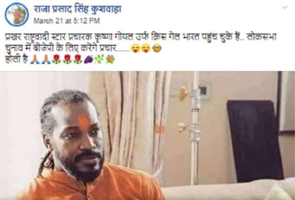 കാവി കുറിയും ജുബ്ബയും, ക്രിസ് ഗെയ്ല് ബി.ജെ.പിയില് ചേര്ന്നോ...?; സത്യം ഇങ്ങനെ