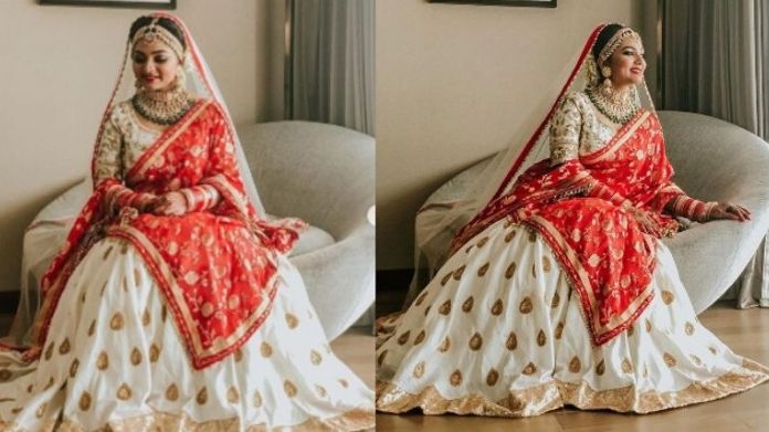 ഉത്തരേന്ത്യൻ വധുവിനെ അനുസ്മരിപ്പിക്കുന്ന രീതിയിലാണ് ശ്രീലക്ഷ്മി വിവാഹത്തിന് ഒരുങ്ങിയത്. ഓഫ് വൈറ്റും ചുവപ്പ് കോംബിനേഷനിലുള്ള ലെഹംഗയണിഞ്ഞാണ് ശ്രീലക്ഷ്മി വിവാഹ വേദിയിലെത്തിയത്. . ഗോള്ഡന് ത്രെഡ് വര്ക്കുകൾ നിറഞ്ഞ ദുപ്പട്ടയും, ചെറിയ ചുവപ്പ് ബോർഡറുള്ള വെള്ള ഷീറും ശ്രീലക്ഷ്മിയെ അതീവ സുന്ദരിയാക്കി. കല്ലുകൾ പതിച്ച ചോക്കർ, നെറ്റിച്ചുട്ടി, ചുവപ്പും ഗോൾഡൻ നിറത്തിലുള്ള വളകൾ എന്നിവയായിരുന്നു ആഭരണങ്ങൾ. മെറൂൺ നിറണത്തിലുള്ള കോട്ടും സ്യൂട്ടുമായിരുന്നു ജഹാംഗീറിന്റെ വേഷം.