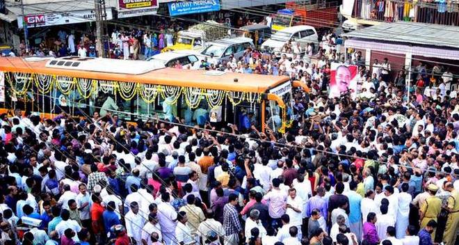 ഇന്ന് രാവിലോയോടെയാണ് മാണിയുടെ ഭൗതിക ശരീരം പാലായിലെ കരിങ്ങോഴക്കൽ വീട്ടിൽ എത്തിച്ചത്. ആയിരക്കണക്കിന് ആളുകൾ രാവിലെ തന്നെ കെ എം മാണിയെ അവസാനമായി ഒരുനോക്ക് കാണാൻ കരിങ്ങോഴയ്ക്കൽ വീട്ടിലേക്ക് എത്തിയിരുന്നു. പ്രത്യേകം സജ്ജീകരിച്ച കെഎസ്ആർടിസി ബസിൽ നിന്ന് നേതാക്കൾ മൃതശരീരം വീട്ടിനുള്ളിലെ ഹാളിലേക്ക് മാറ്റി