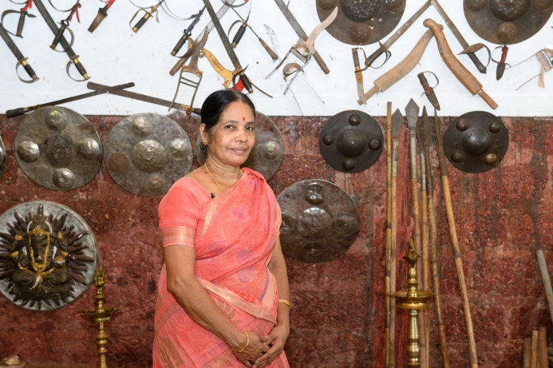 'താണമര്ന്ന് ഭൂമി തൊട്ട് വന്ദിച്ച് പഴുതുനോക്കി ചാടി ഇടപുറം കണ്ട് വീണ് പന്തിചേര്ന്ന് ഉരുത്തിപരിചചുഴറ്റി വാള്തൊഴുത് വാങ്ങിത്തിരിഞ്ഞുചാടി മുഖം കണ്ടു നില്ക, വാള് ചുഴറ്റി വീശിത്തിരിഞ്ഞ് അമര്ന്ന് മാറ്റാനെ നോക്കി ഗജമുഖം കണ്ടടുത്ത് വീശിവെട്ടി വലതു വീശി മൂന്ന് വെട്ടിചുഴറ്റിത്തിരിഞ്ഞ് മാറിക്കുതിച്ച്ചാടി പരിചയില് താണമര്ന്ന് ഏറ്റുവാങ്ങിപ്പിരിഞ്ഞ് വീശിമാറിപ്പൊങ്ങി നിലയമര്ന്നു നില്ക….' ഈ വായ്ത്താരി മീനാക്ഷിയമ്മയ്ക്ക് ജീവിതത്തിന്റെ താളമാണ്… ആറര പതിറ്റാണ്ടിലേറെയായി കളരിപ്പയറ്റ് പഠിക്കുകയും പരിശീലിപ്പിക്കുകയും ചെയ്യുന്നയാളാണ് മീനാക്ഷിയമ്മ. ഏഴാം വയസില് പിതാവാണ് കളരിയിലേക്ക് മീനാക്ഷിഅമ്മയെ കൊണ്ടുവന്നത്. അന്നുമുതല് കളരിയാണ് ഇവരുടെ ജീവിതം.