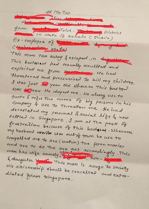 സിംഗപ്പൂര്: പ്രമുഖ സിംഗപ്പൂര് മലയാളിക്കെതിരായി മീടു ആരോപണങ്ങള് അടങ്ങുന്ന യുവതിയുടെ കത്ത് പ്രവാസി എക്സ്പ്രസ്സിന്റെ ഓഫീസില് ലഭിച്ചു. എതാണ്ട് എട്ടു വര്ഷത്തോളം തന്നെ മാനസികമായും ലൈംഗികമായും പീഢിപ്പിച്ചുവെന്നാണ് ആരോപണം. തുടര്ന്ന് സിംഗപ്പൂരിലേക്കു കടന്ന ഇയാള് ഇവിടെ സ്ഥിരതാമസമാക്കിയെന്നാണു കത്തില് പറയുന്നത്.