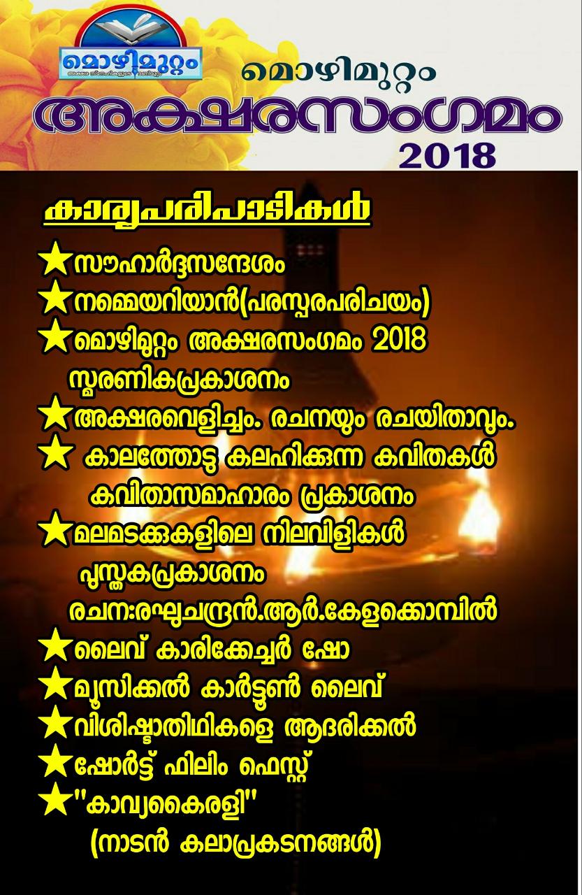 അക്ഷരങ്ങളിലൂടെ സംവേദിക്കുന്ന ഓരോ സൗഹൃദങ്ങൾക്കും മുഖാമുഖം കാണുവാനൊരവസരം. തദവസരത്തിൽ അക്ഷരങ്ങളിലൂടെ നമ്മെ വിസ്മയിപ്പിച്ചിട്ടുള്ള മുപ്പതോളം മുഖ്യധാരാ എഴുത്തുകാരുടെ രചനകൾക്കൊപ്പം നമ്മളിൽ നിന്ന് തിരഞ്ഞെടുക്കപ്പെട്ട സൗഹൃദങ്ങളുടെ രചനകളും ഉൾക്കൊള്ളിച്ച് പുറത്തിറങ്ങുന്ന "മൊഴിമുറ്റം അക്ഷരസംഗമം 2018 സ്മരണിക പ്രകാശനം" നഷ്ടമാകുന്ന വായനയെ വീണ്ടെടുക്കാനാനുള്ള മൊഴിമുറ്റത്തിന്റെ എളിയശ്രമമാണ്. നമുക്കിടയിലെ തന്നെ സൗഹൃദങ്ങളൊത്തുചേർന്ന് കവിതയുടെ നൂതനവഴികളിലൂടെ സംവേദിക്കുന്ന "കാലത്തോടു കലഹിക്കുന്ന കവിതകൾ" എന്ന കവിതാസമാഹാരപ്രകാശനം, വായനയിലൂടെ നമുക്കിടയിലെതന്നെ സൗഹൃദങ്ങളുടെ പ്രസിദ്ധീകൃതമായ കൃതികളുടെ പ്രദർശനവും വില്പനയും ലക്ഷ്യമിട്ടുള്ള "അക്ഷരവെളിച്ചം", പുസ്തകപരിചയം,പുസ്തകങ്ങളുടെ പ്രദർശനവും വില്പനയും, കേരള കാർട്ടൂൺ അക്കാദമി ആക്ടിംഗ് ചെയർമാൻ ഇബ്രാഹിം ബാദുഷയും സംഘവുമവതരിപ്പിക്കുന്ന കാരിക്കേച്ചർ & കാർട്ടൂൺ ലൈവ്, ആദരസമർപ്പണം, ഹ്രസ്വചിത്രപ്രദർശനം, സാഹിത്യസംബന്ധമായ ചർച്ചകൾ, സംവാദങ്ങൾ, കവിതാലാപനം, ഗാനാലാപനത്തോടൊപ്പമുള്ള കാർട്ടൂൺരചനയെന്ന ദ്വിമുഖപ്രകടനം, മറ്റു നാടൻ കലാപരിപാടികൾ എന്നീ വൈവിധ്യമേറിയ വിഭവങ്ങളാൽ മുഖപുസ്തകചരിത്രത്തിൽ നാളിതുവരെയുള്ള ചരിത്രം തിരുത്തിക്കുറിക്കാനൊരുങ്ങുകയാണ് മൊഴിമുറ്റം അക്ഷരസംഗമം 2018.
