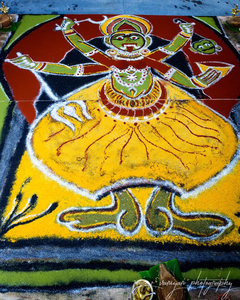 A few members of the 11 member troupe from Mudiyettu Sangham Keezhilam first and foremost set about to draw an elaborate Kalam, pictorial drawing of Goddess Kali. It took them more than 3 hours. Some others set about getting ready with their time consuming costumes and make up while some chipped and shaped the tender coconut fronds, which they needed to use liberally and others worked on making the flambeaux.