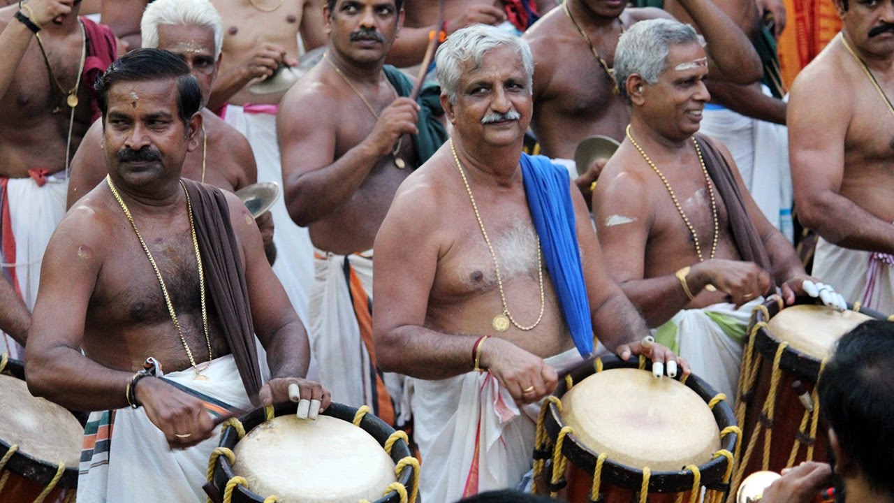The highlight of the festival, the orchestral ensemble is led by huge groups of 200 musicians performing rhythmically with percussion instruments of Timila, Maddalam, Ilathalam,and Idakka and Kombu a wind instrument. Orchestra follows a certain pattern of rhythmic beats which is much lauded by the staunch supporters who go berserk with joy closely following every beat. The ensemble is led by stalwarts in the field.