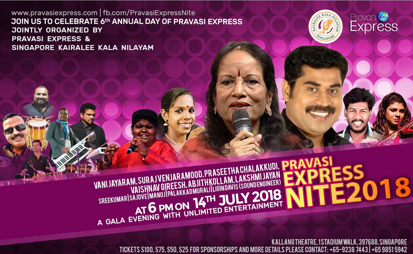 സിംഗപ്പൂര്: പ്രവാസി എക്സ്പ്രസിന്റെ ആറാമത് വാര്ഷികാഘോഷം പ്രവാസി എക്സ്പ്രസ് നൈറ്റ് 2018 ജൂലൈ 14 ന് കല്ലാങ്ങ് തിയേറ്ററില് വെച്ച് നടക്കും. ഇന്ത്യന് പിന്നണി ഗാനരംഗത്ത് മാറ്റം വെക്കാനില്ലാത്ത ഗാന ഇതിഹാസം വാണി ജയറാം പ്രവാസി എക്സ്പ്രസ് നൈറ്റില് സംഗീത നിശ നയിക്കും.. അവരോടൊപ്പം സോഷ്യല് മീഡിയ സെന്സേഷന് ആയ പിന്നിഗായകന് കൊല്ലം അഭിജിത്ത്, കലാഭവന് മണിക്ക് ശേഷം നാടന് പാട്ടിന് വ്യത്യസ്ത മാനങ്ങള് നല്കിയ ഫോക്ക് ഗായിക പ്രസീദ ചാലക്കുടി, പ്ലേബാക്ക് സിംഗര് ലക്ഷ്മി ജയന്, സിടിവിയുടെ 'സരിഗമപ’യിലൂടെ സെന്സേഷന് ആയ യുവ ഗായകന് വൈഷ്ണവ് ഗിരീഷ്, എന്നിവര് അണിനിരക്കും.. സംഗീതനിശയുടെ ഓര്ക്കസ്ട്ര ചെയ്യുന്നത് പാലക്കാട് മുരളിയും സംഘവുമാണ്.