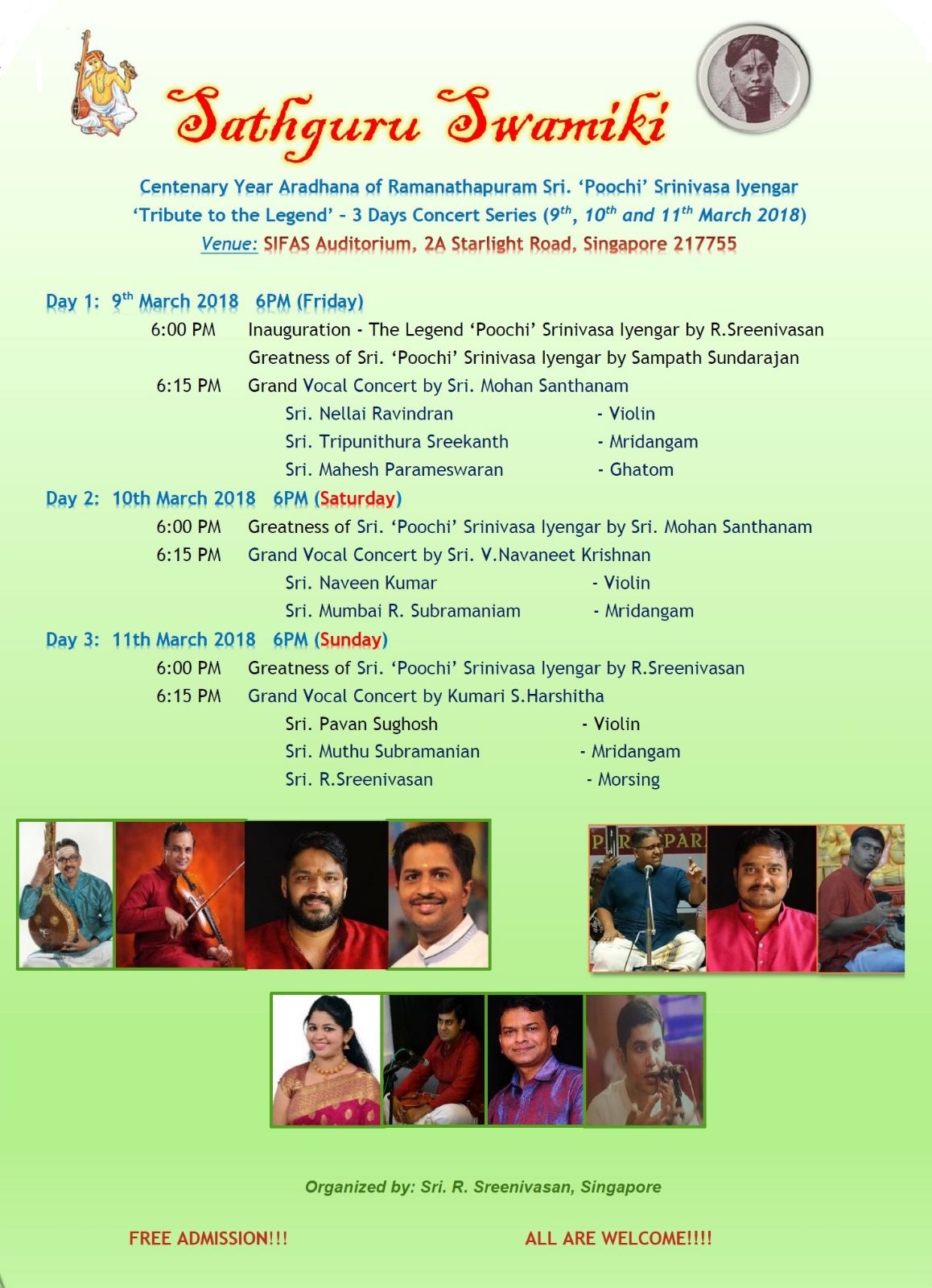 Singapore: Centenary Year Aradhana for the Legendary Vocalist/Composer Ramanathapuram Sri. Poochi Srinivasa Iyengar, "Tribute to legend -3 days Concert Series on from 9th-11th March 2018 6:00 PM onwards at SIFAS.. Free adminission, all are welcome.