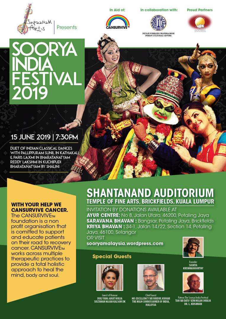 പള്ളിപ്പുറം സുനിലിന്റെ കഥകളി, പാരിസ് ലക്ഷ്മിയുടെ ഭരതനാട്യം, റെഡ്ഡി ലക്ഷ്മിയുടെ കുച്ചിപ്പുടി ഇതോടൊപ്പം മലേഷ്യൻ കലാകാരി ശാലിനി അവതരിപ്പിക്കുന്ന ഭരതനാട്യം എന്നിവയടങ്ങിയ ഇന്ത്യൻ ക്ലാസിക്കൽ ഡാൻസിന്റെ മഹത്തായ പാരമ്പര്യം ഉൾക്കൊണ്ടുകൊണ്ടുള്ള ഒരു ക്രോസ് സെക്ഷൻ അവതരണമാണ് ഇത്തവണ സൂര്യ ഫെസ്റ്റിവൽ 2019ൽ ഉള്ളത്.