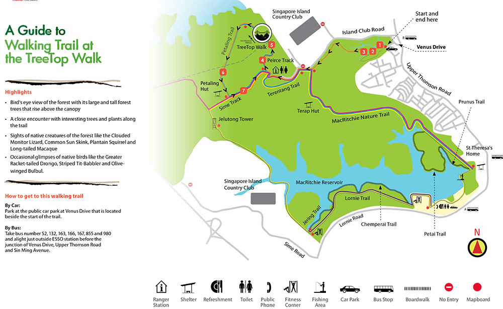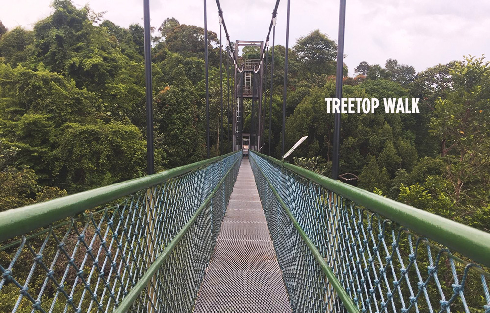 വനമേഖലയിൽ നിന്നും ഏതാണ്ട് 25 മീറ്റർ ഉയരത്തിലാണ് ഈ പാലം സ്ഥിതിചെയ്യുന്നത്. ഈ നടപ്പാതയുടെ അകെ ദൈർഘ്യം 250 മീറ്ററാണ്. വനത്തിലൂടെ 5 കിലോമീറ്റർ താണ്ടിയാണ് ട്രീ ടോപ്പ് വോക്കിൽ എത്തിച്ചേരുന്നത് 7 മുതൽ 10 കിലോമീറ്റർ വരെയെടുക്കും ട്രീ ടോപ്പിൽ പോയി തിരിച്ചെത്താൻ.ഇവിടേയ്ക്ക് പോകുന്ന സഞ്ചാരികൾ 3 മുതൽ 5 മണിക്കൂർ വരെ നീക്കിവെക്കേണ്ടതുണ്ട് വനത്തിലൂടെയുള്ള ഈ നീണ്ട പദയാത്ര നടത്താനായി!. പക്ഷേ സിംഗപ്പൂരിലെ ഈ വനത്തിലൂടെയുള്ള യാത്രയും ട്രീ ടോപ്പ് വോക്കിലൂടെയുള്ള നടത്തവും ഏതൊരു സഞ്ചാരിയെയും ഏറെ മോഹിപ്പിക്കുന്നതാണ്. നടന്നു ക്ഷീണിച്ചിരുന്നെങ്കിലും ട്രീ ടോപ്പിൽ നിന്നുള്ള കാഴ്ചകൾ മനസ്സിന് ഒരു പുത്തൻ ഉണർവ് നേടിത്തന്നു.അവിടെ നിന്ന് കൊണ്ട് ഞാൻ പ്രകൃതിയെ പ്രണയിച്ചു!