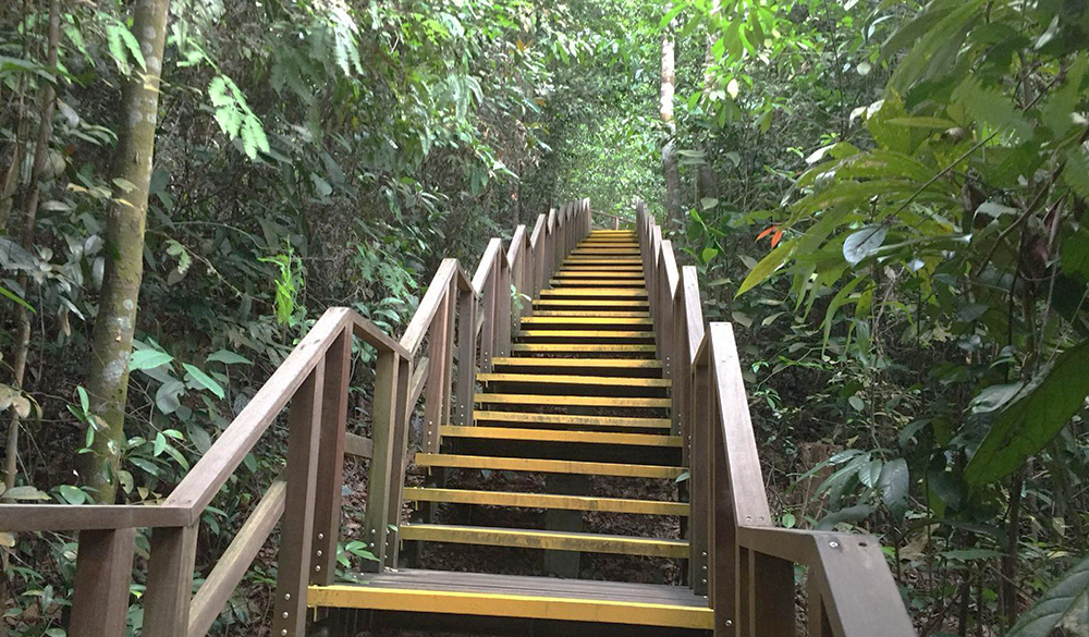 മൺപാതയിലൂടെയുള്ള നീണ്ടനടത്തത്തിനൊടുവിൽ ചെന്നെത്തുന്നത് കുത്തനെയുള്ള പടവുകളിലേക്കായിരുന്നു. അവിടെ നിന്നും അധികദൂരമില്ല ട്രീ ടോപ്പിൽ എത്തി ചേരാൻ. പടവുകളെല്ലാം മഞ്ഞ നിറത്തിൽ മനോഹരമായി പെയിന്റ് ചെയ്തു സൂക്ഷിച്ചിരിക്കുന്നു.